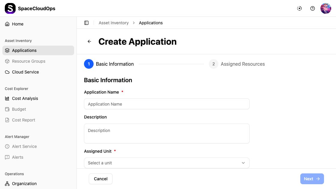 Clicking Create Applications takes you to the Create Application form under Asset Inventory > Applications. The creation form has 2 steps: