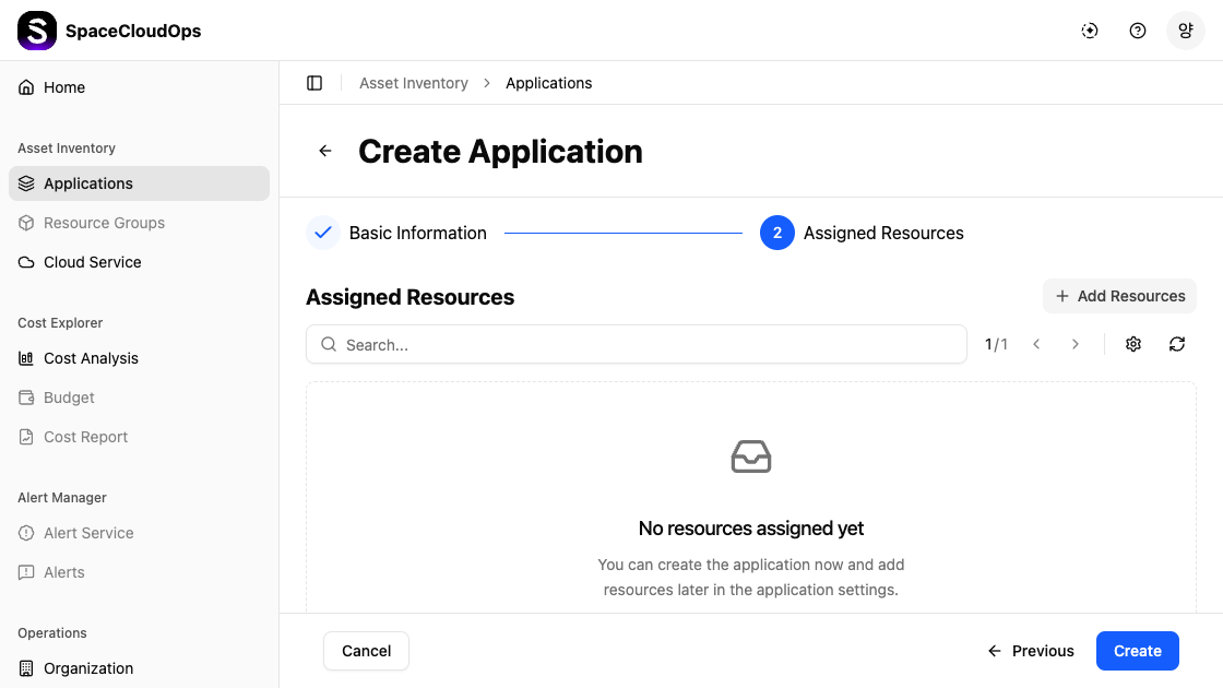 Step 2. Assigned Resources — Assign cloud resources to the application. You can skip this step and add resources later.