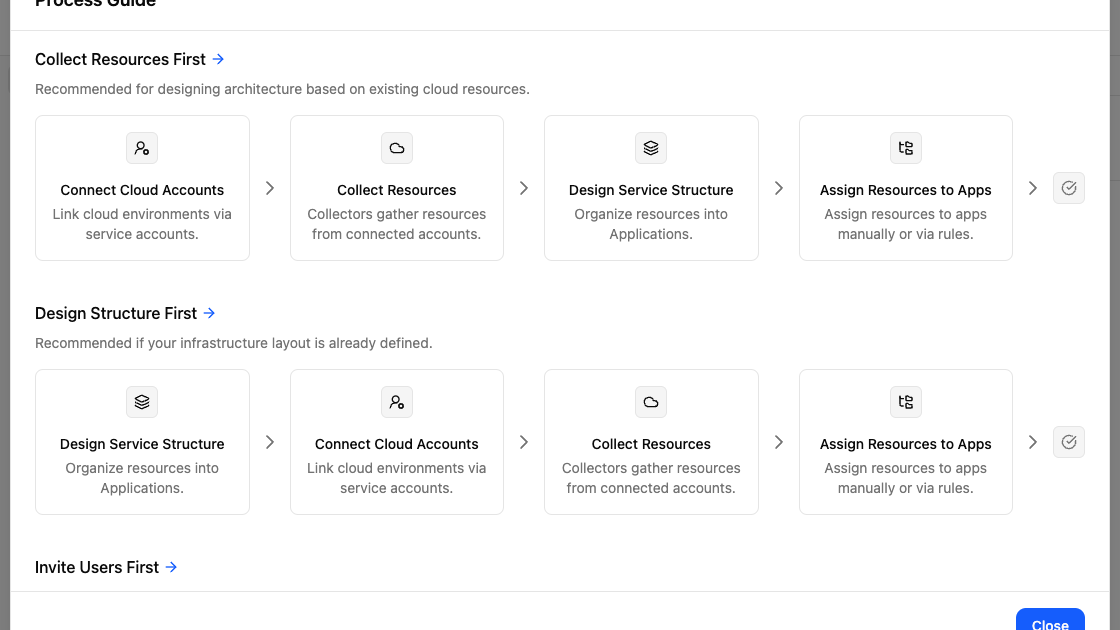 | Design Structure First | Recommended when your infrastructure layout is already defined | Design Service Structure → Connect Cloud Accounts → Collect Resources → Assign Resources to Apps |