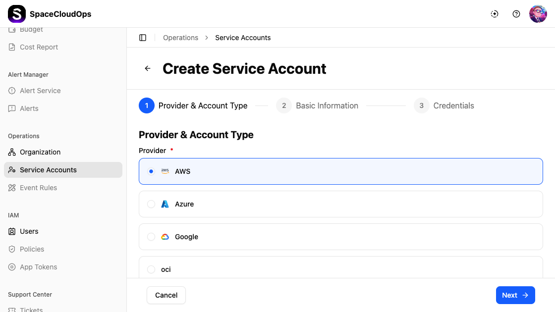 Step 1. Provider & Account Type — Select the cloud provider and account type.