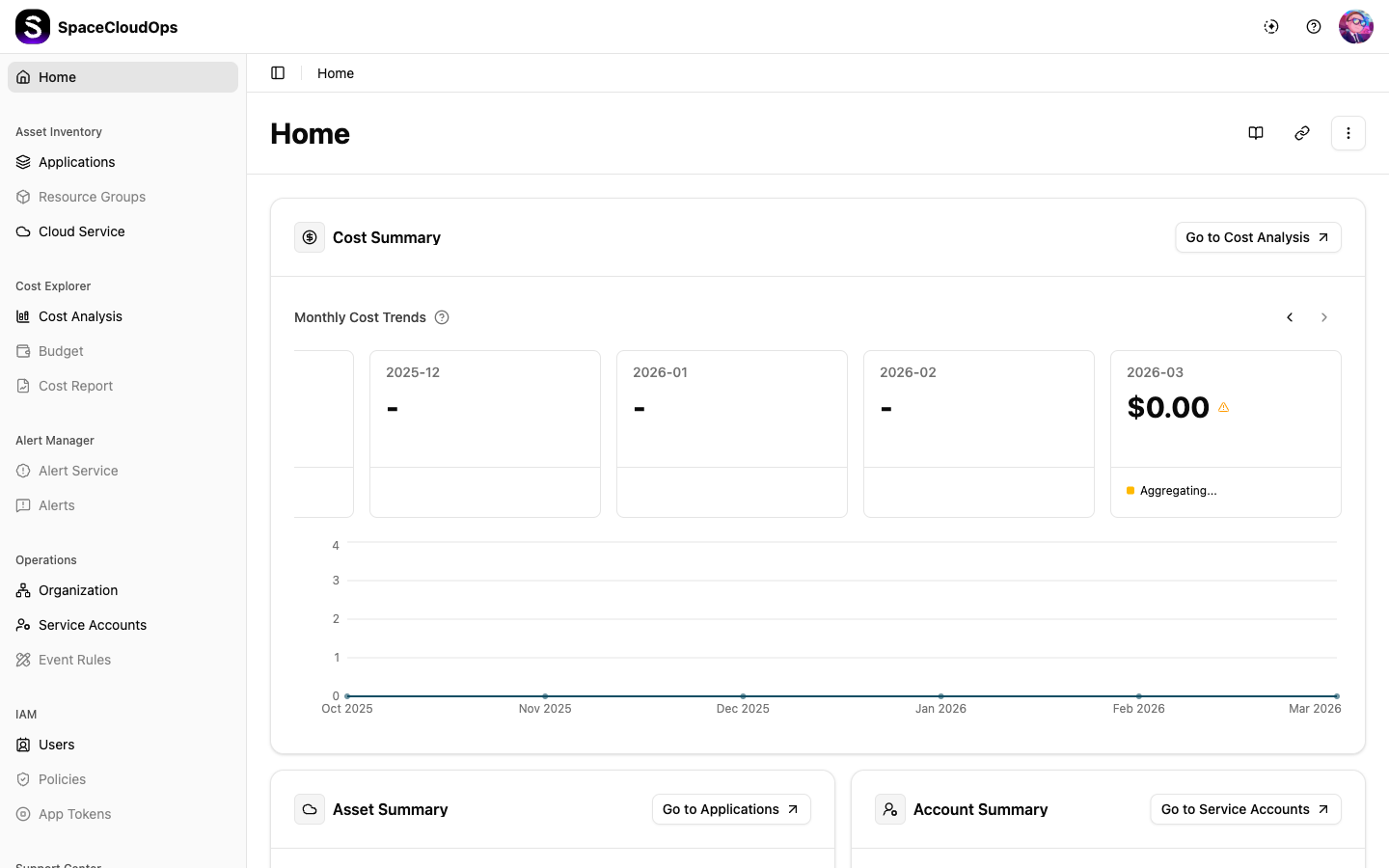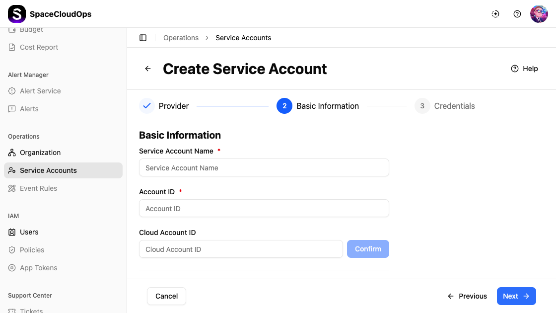 | Create Service Accounts | Connect your cloud accounts to collect resources | Operations > Service Accounts |