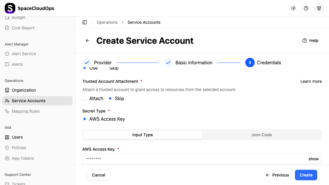 | Credential Fields | Yes | Provider-specific fields (e.g., AWS Access Key) — values are masked for security |